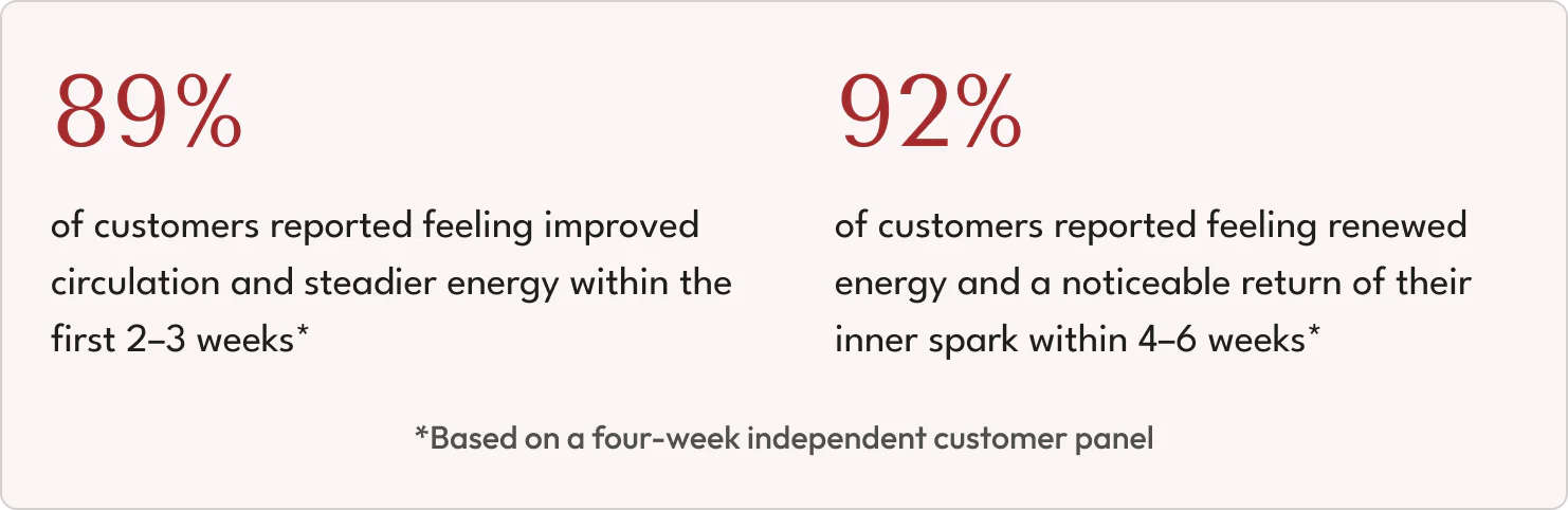 Most customers report an initial energy boost within the first week, with significant circulation improvements by 2–3 weeks. The complete transformation—feeling decades younger with sustained all-day energy—typically develops over 2–3 months of consistent use.